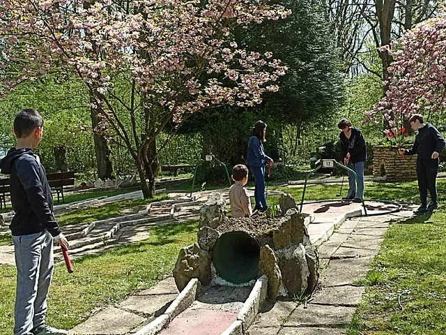 Situé dans un parc arboré de 1600m2, entièrement clos, le mini-golf profite d’un environnement calme et verdoyant.